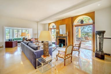 Located in Cap d'Antibes, near the Hôtel du Cap, this magnificent early-century character house (approximately 600 m² of living space) features a high-quality bourgeois interior and superb views of the park and sea, Cap d'Antibes, and the Bay of Cannes, on a wooded and enclosed park of 7,000 m².