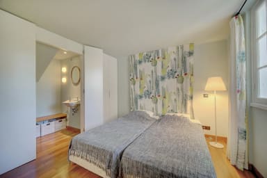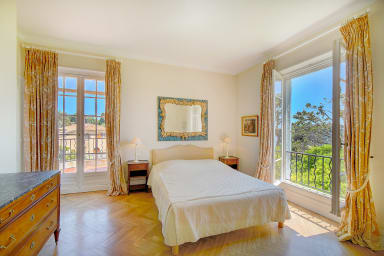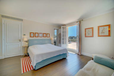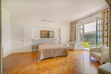 Large master suite facing the sea, including a double bedroom of approximately 30 m², 1 bed (160 x 200), opening onto a terrace with park and Cap d'Antibes view, 1 complete marble bathroom with WC, 2 dressing rooms, a living room, TV, DVD, with sea view.
