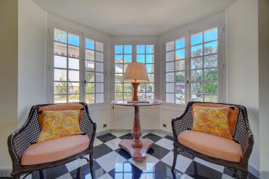 Located in Cap d'Antibes, near the Hôtel du Cap, a magnificent character house from the early century (approximately 600m² of living space), bourgeois interior of quality, superb view of the park and sea, Cap d'Antibes and Cannes bay on a wooded and enclosed park of 7,000m².