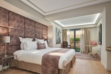 Master Room 5: Double bed (180x200cm), television, dressing room, bathroom with bath and shower, separated toilets. Private terrace, garden access, with table and chairs, 2 long chairs.