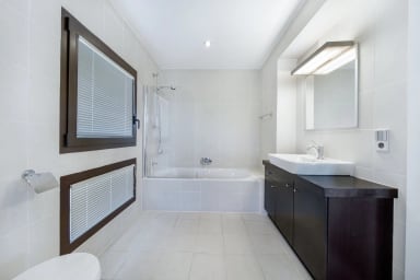 Ensuite bathroom with bath, shower, double washbasin and toilet