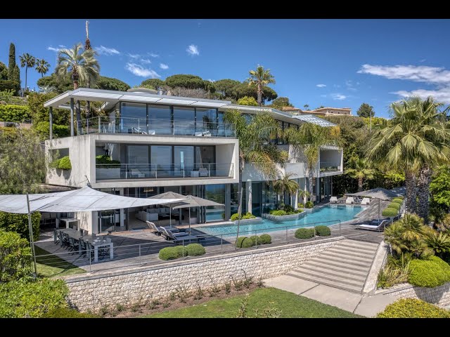Beautiful modern villa, air-conditioned, with 640 sqm of living space on 4 levels with lift, in the heart of 3,000 sqm of land, enjoying a beautiful panoramic sea view, from the Lérins Islands to Cap d'Antibes.