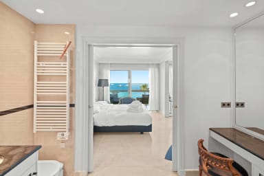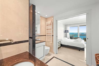 The apartment features a spacious living room with seating for 8 + wall-mounted TV. Access to sea-view terrace.