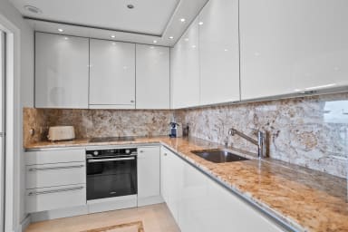 Fully equipped open kitchen with oven, microwave, Mielle dishwasher.
