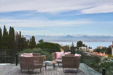 Roof terrace of 100sqm fully furnished with designer furniture, superb sea view, view of the Alps, Nice, Cap Ferrat and the lighthouse of Cap d'Antibes, equipped with a corner sofa, a second lounge with chairs and coffee tables, 2 sunbeds and 2 umbrellas, a large stone and wood bar with sink.