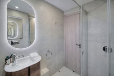 The sleeping area comprises two en suite bedrooms, each with en-suite shower room, toilet, dressing room and flat-screen TV.