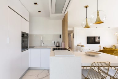 Fully equipped open-plan kitchen with fridge, freezer, oven, microwave, induction hob, hood, dishwasher and Nespresso coffee machine.