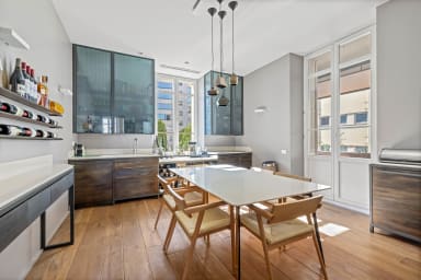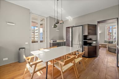 The apartment comprises a living room, a fully-equipped kitchen with dining area, three bedrooms and three bathrooms, providing a comfortable and functional space for several people.