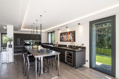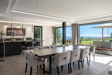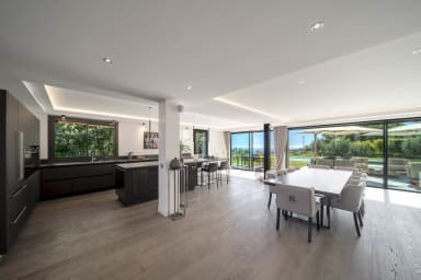 Salle à manger avec une grande table pour 10 personnes et cuisine ouverte totalement équipée : réfrigérateur américain, four micro-onde, four, machine à café Siemens, lave-vaisselle, plaque à induction, cave à vin et un bel îlot central finissant en table haute pour 5 personnes.