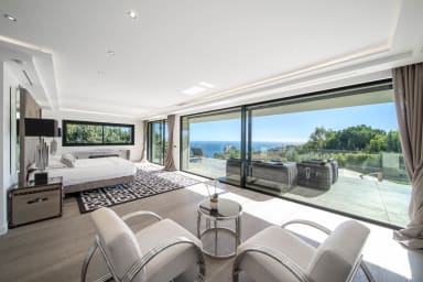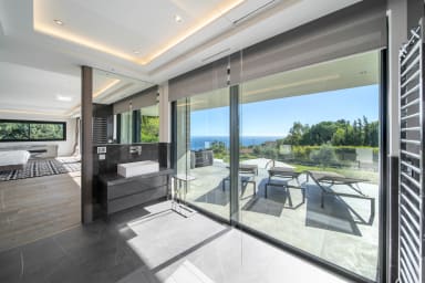 Chambre N°3 : Suite indépendante avec un petit salon (2 fauteuils), donnant sur une terrasse privée (17x4m) vue mer et jardin, et deux salles de bain : une salle de douche avec douche italienne, dressing, toilette et une autre salle de bain avec baignoire et douche italienne, dressing, toilette.