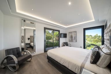Chambre N°2 : lit double (180cm) accès direct jardin et piscine, dressing, salle de bain avec baignoire, douche italienne, double vasque et toilette.
