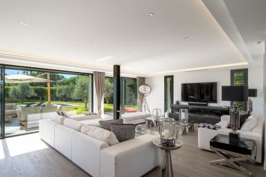 Grand coin salon avec baies vitrées électroniques donnant sur le jardin et la piscine, 2 canapés, télévision et cheminée à l’éthanol.