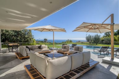 Salon d’été équipé de 2 canapés, 4 fauteuils, 2 tables basses, 4 chaises, 2 parasols.