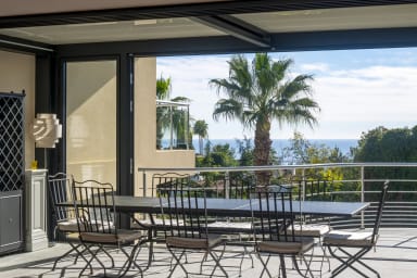 Coin salon : Équipé de deux canapés et d’une télévision, il ouvre sur une terrasse couverte avec vue mer et piscine, où une table pour 10 personnes est installée.
