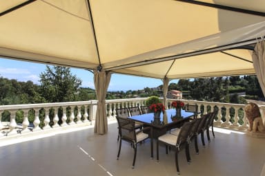 Salle à manger 12 personnes, ouvrant sur la même terrasse. Jolie terrasse vue dominante, table repas pour 12 à 14 personnes, barbecue.