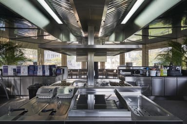 Une cuisine entièrement équipé : Réfrigérateur, congélateur, plaque de cuisson, four, micro-ondes, hotte, cave à vin. Ascenseur desservant le niveau inférieur et supérieur.