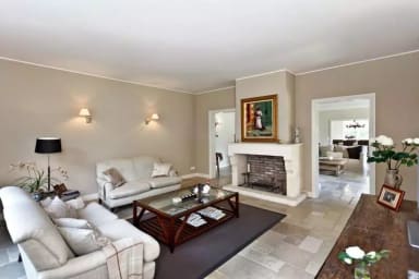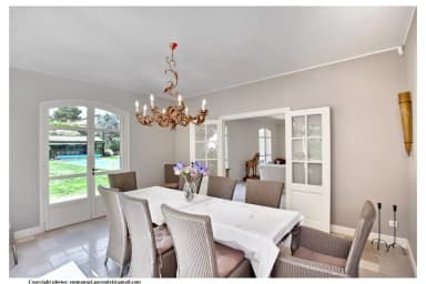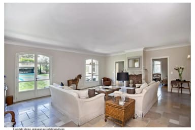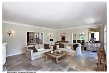 L'entrée imposante mène directement à la salle de séjour lumineuse et spacieuse qui ouvre sur le jardin et la piscine.