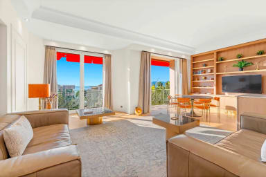 Profitez d’un séjour d’exception dans ce superbe appartement de 145 m², entièrement rénové et décoré avec soin. Traversant et ultra lumineux, il offre une vue imprenable sur la mer et les jardins, que vous pourrez admirer depuis le balcon exposé plein sud.