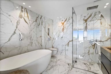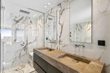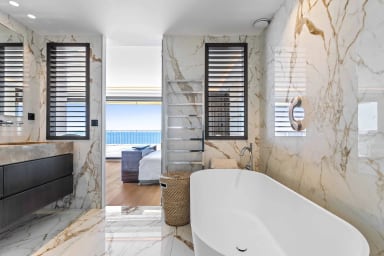Une grande chambre de maître ouvrant sur la terrasse vue mer, dressing, salle de bain vue mer avec douche, baignoire, doubles vasques, toilettes.